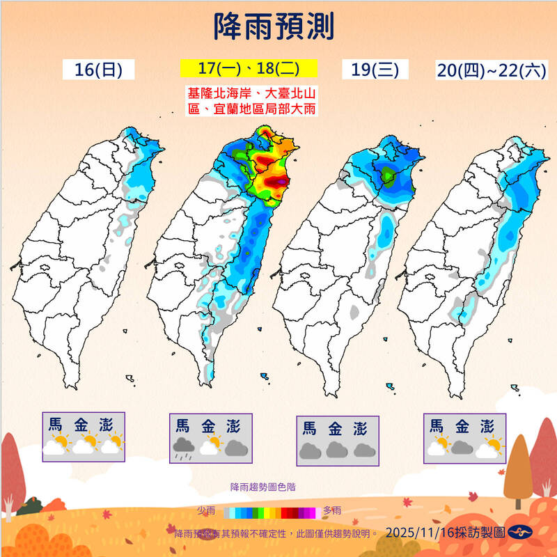 明天東北季風增強,週一及週二基隆北海岸、大台北山區、宜蘭地區局部大雨,桃園以北降雨機會也偏高,有短暫降雨,竹苗、花蓮局部短暫雨,台東、恆春半島、中南部山區零星雨勢,中南部平地多雲到晴;週三水氣減少,北部、宜花局部短暫雨,台東、恆春零星降雨,中南部多雲到晴;週四至週六,水氣再減,基隆北海岸、東半部、大台北山區短暫雨,其他地區多雲到晴。