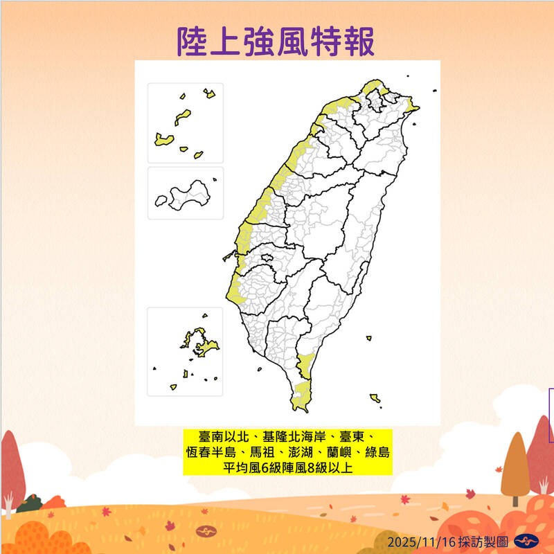 張承傳提醒,今明兩天台南以北、基隆北海岸、台東、蘭嶼、綠島、恆春半島、馬祖、澎湖留意平均6級、陣風8級以上強風。
