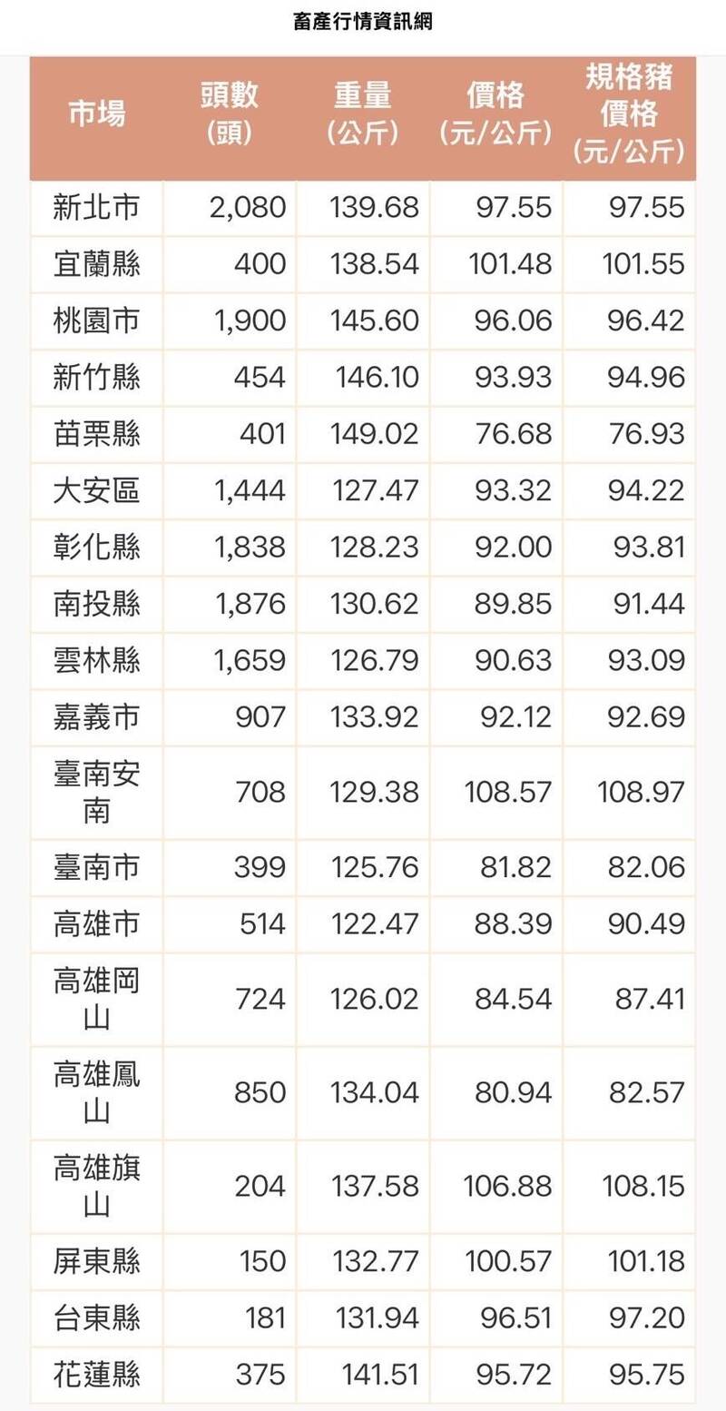 11月15日的全台豬隻拍賣行情表,南投縣在90元以下,苗栗更跌至80元以下。(圖擷自網路)