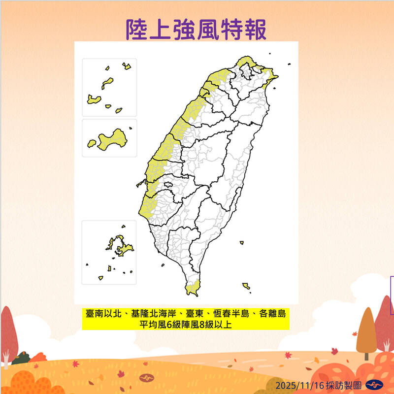 張承傳提醒,明天風力明顯增強,尤其是下半天。台南以北、基隆北海岸、恆春半島、各離島留意平均6級、陣風8級以上強風,除沿海地區,部分內陸地區風力也較強。