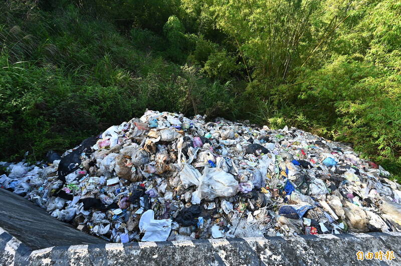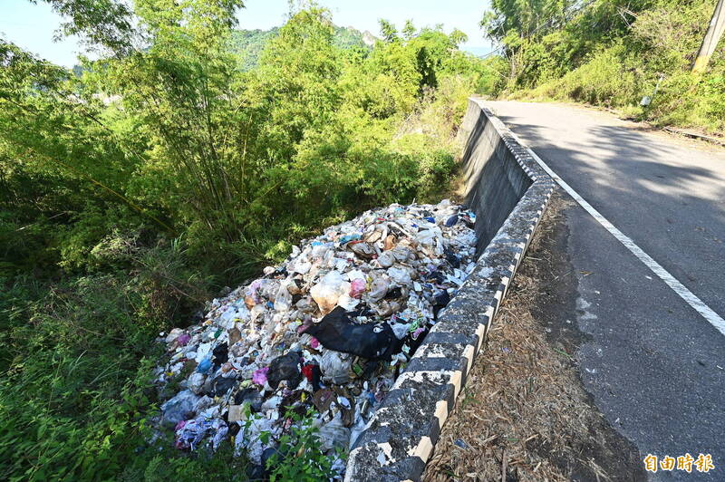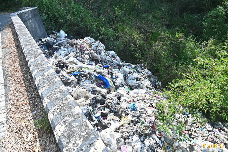 高雄燕巢月世界周遭被人為蓄意傾倒大量垃圾,由於位置山坡隱蔽,不易被人發現,短短兩年時間垃圾堆積如山,快淹至路面。(記者李惠洲攝)