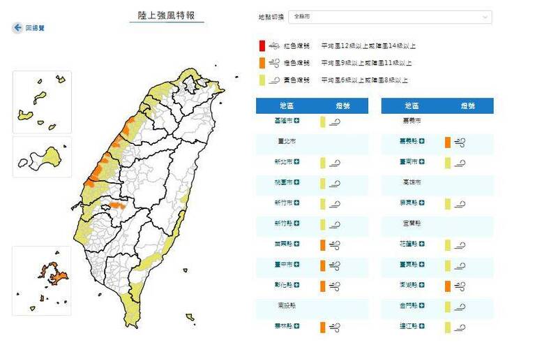 氣象署下午4點35分,針對17縣市發布陸上強風特報。(擷取自中央氣象署官網)
