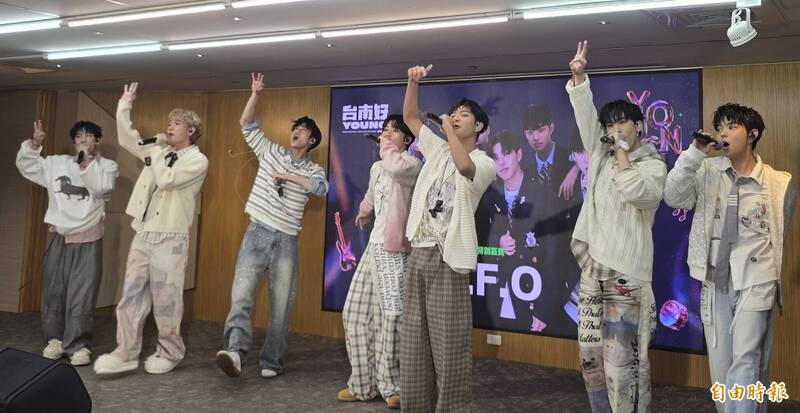 台南市長黃偉哲(右四)與男團F.F.O 同框宣傳,自嘲年紀、顏值輸很大。(記者洪瑞琴攝)