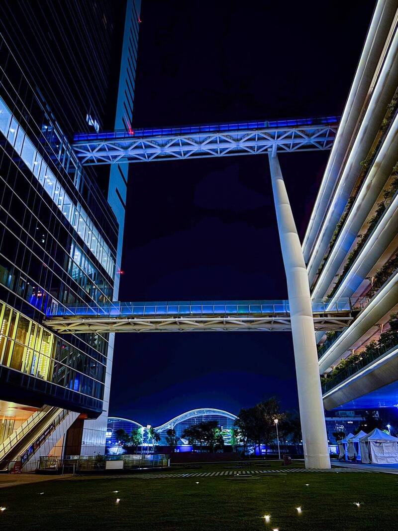 承億酒店連接高雄市立圖書館總館的空橋也換上藍光新裝。(承億提供)