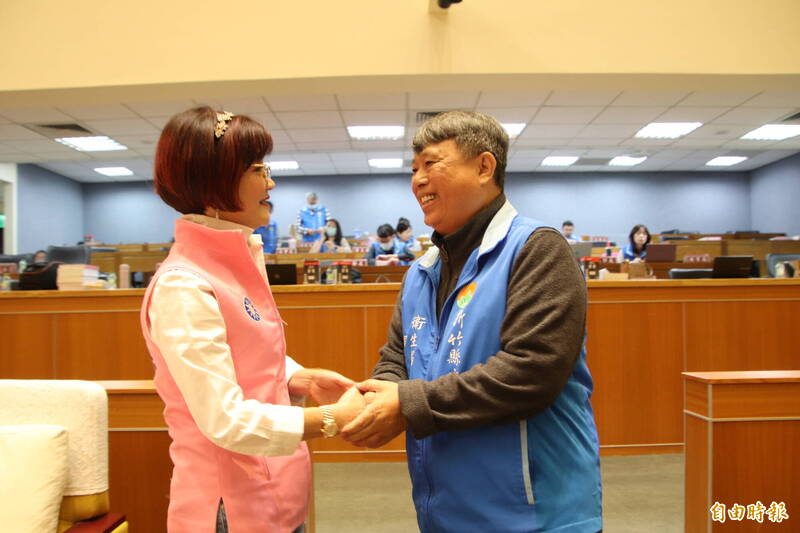 新竹縣議員上官秋燕(左)和新竹縣衛生局長殷東成(右)為了補助老人做假牙明年就要上路,開心一起握手互相道賀。(記者黃美珠攝)