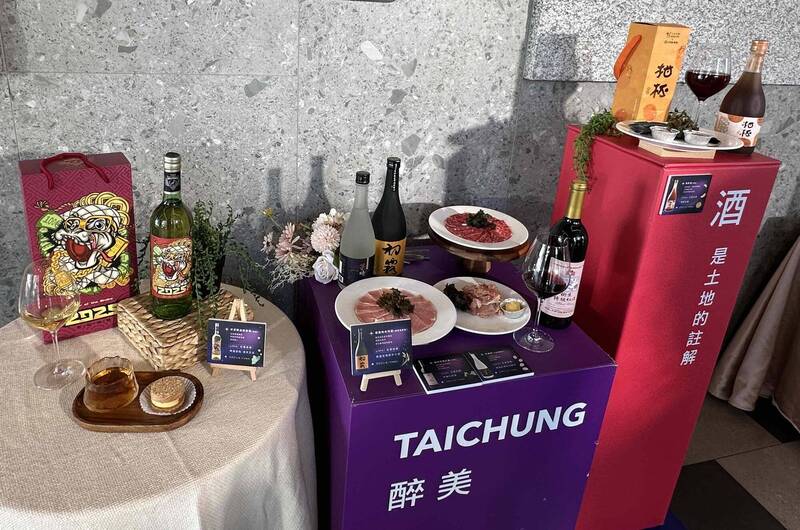 台中地酒霧峰初霧純米吟釀、后里樹生酒莊特級紅酒、石岡柑杯酒、大安芋燒酎及外埔仟百醇白葡萄酒。(台中市農業局提供)
