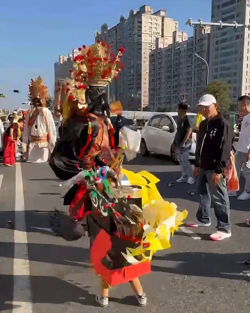 三媽聖駕遇見小八爺在路邊「攔鑾轎」跳舞,圍觀民眾拿起手機拍下這溫馨可愛的互動畫面,小八爺日前更巧遇普濟殿正港的八爺,一大、一小在馬路尬舞迅速在網路引起討論。黃小弟的爸媽說,這是萬聖節做的變裝造型,小朋友很喜歡,乾脆就用來迎接北港媽;家裡有信仰,加上小朋友平常就很喜歡八爺,爸爸會教他一些舞步動作,也會帶黃小弟到處看廟會活動。