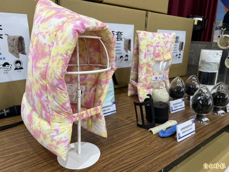 廢棄的漁網變成防震頭套,可承受上百公斤的塌落物。(記者黃淑莉攝)