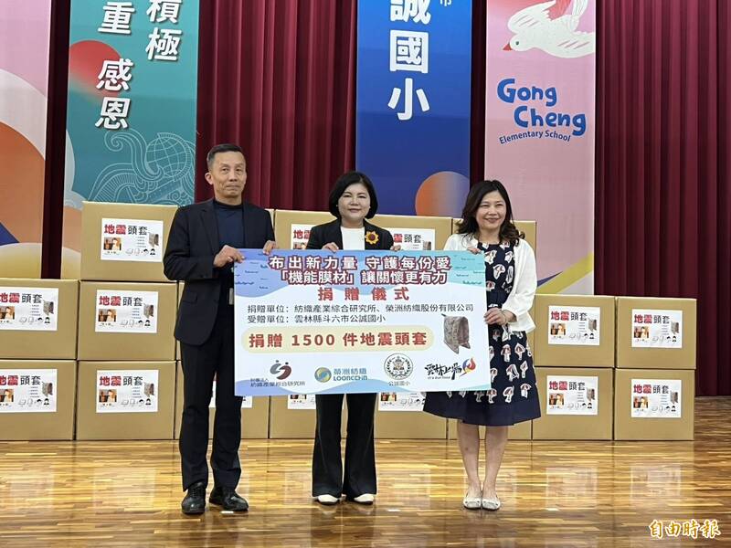 紡織產業綜合研究所與榮洲紡織公司合作把廢棄漁網再利用製成防震頭套,可承受上百公斤面積大的塌陷物,確保頭部安全,今(24)日紡綜所與榮洲共同捐贈1500頂給雲林公誠國小,守護全校師生安全。