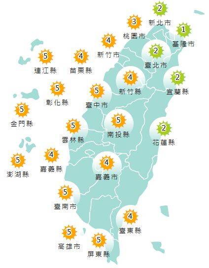 今日各地紫外線指數預報概況。(圖擷取自中央氣象署)