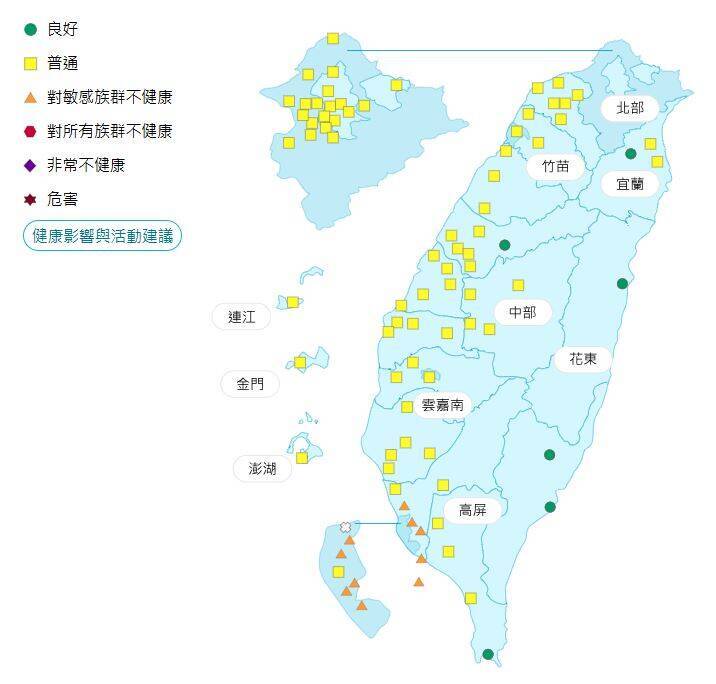 空氣品質部分,竹苗、宜蘭、花東空品區及澎湖為「普通」等級,竹苗可能達橘色提醒等級;北部、中部、雲嘉南、高屏空品區及馬祖、金門為「橘色提醒」等級。
