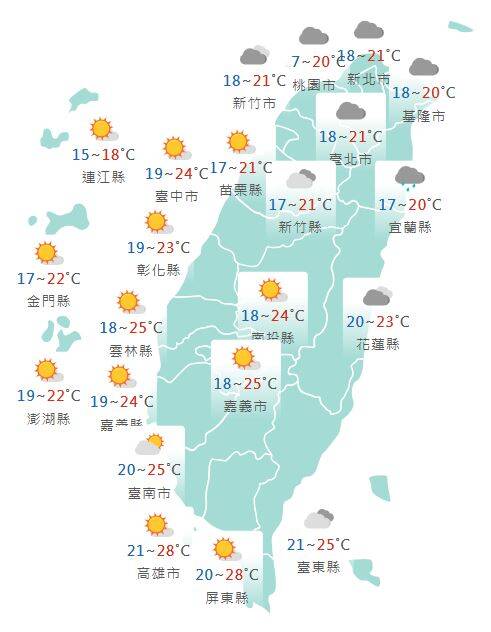 週三至週五各地低溫方面中部以北、東北部及金門、馬祖14至16度,南部、花東及澎湖16至19度;高溫部分,北部、宜花及澎湖20至24度,中南部及台東23至28度,金門19至23度,馬祖15至18度。
