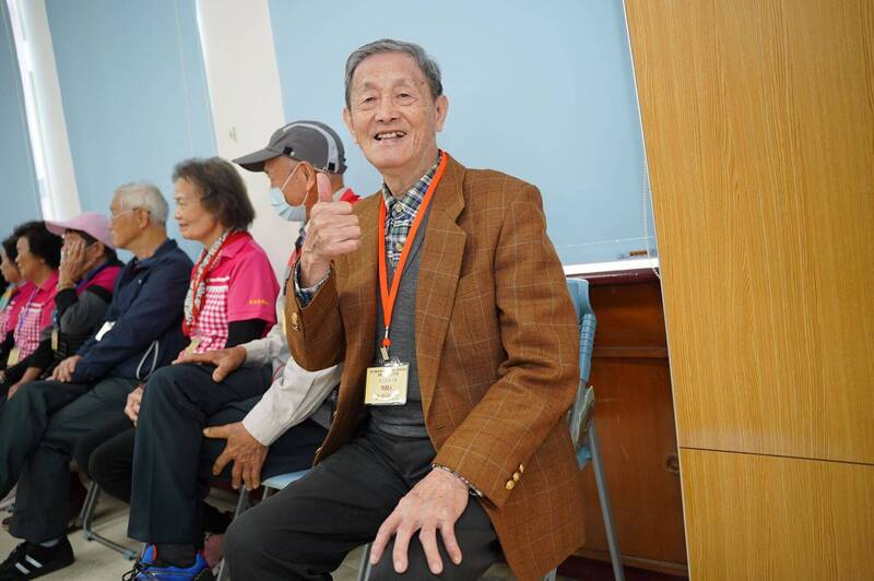 最高齡的耆老志工蘇添明(右1)認為,陪伴是最長情的告白。(新竹縣政府提供)