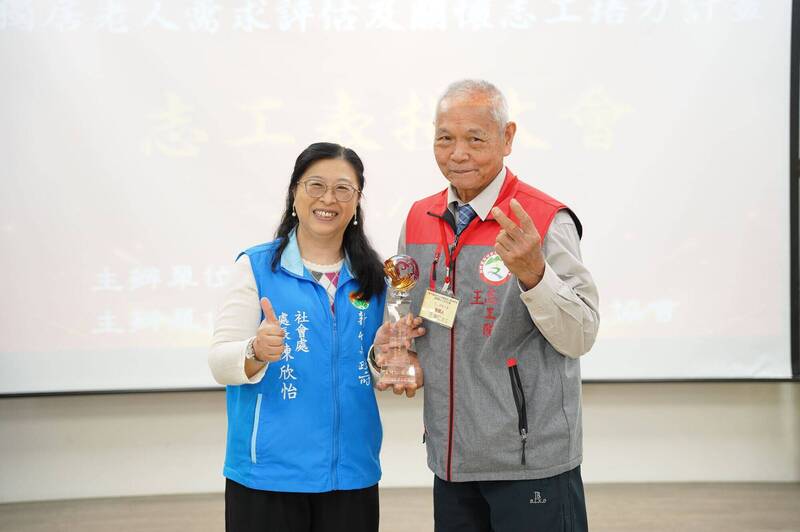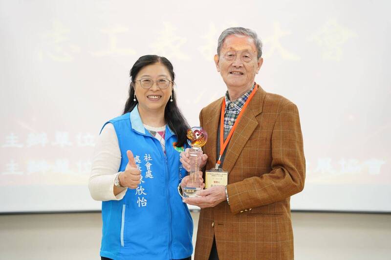 新竹縣社會處長陳欣怡(左)頒獎表揚高齡90歲的蘇添明(右),2年多來累積150小時的志工服務時數。(新竹縣政府提供)