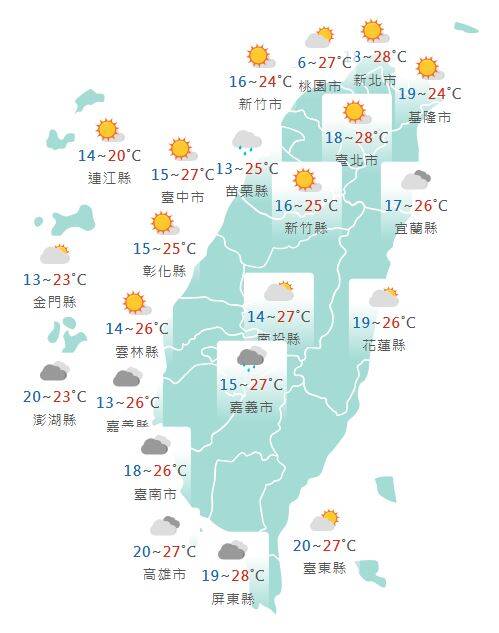 今日新竹至嘉義低溫約13至16度,其他地區低溫約16至20度,白天高溫則可達到24至28度,日夜溫差大。(資料照)