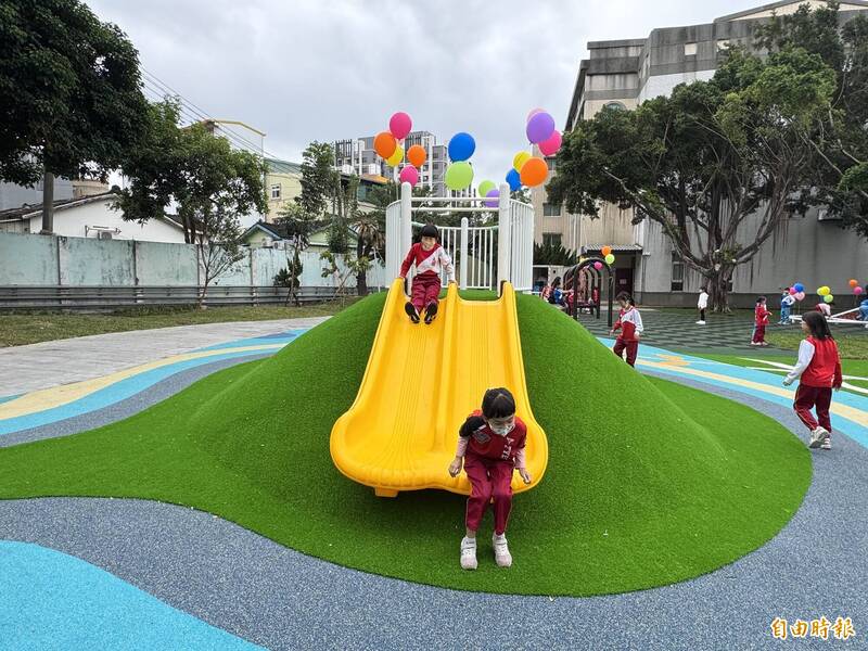 大雅國小「天生幸福遊樂園」落成啟用,小朋友開心溜滑梯。(記者歐素美攝)