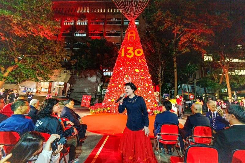 國北教大及校友總會、億光文化基金會為國北教大130週年校慶,結合「雙春金蛇年」意涵,妝點出15米高的火紅耶誕樹。(億光文化基金會提供)
