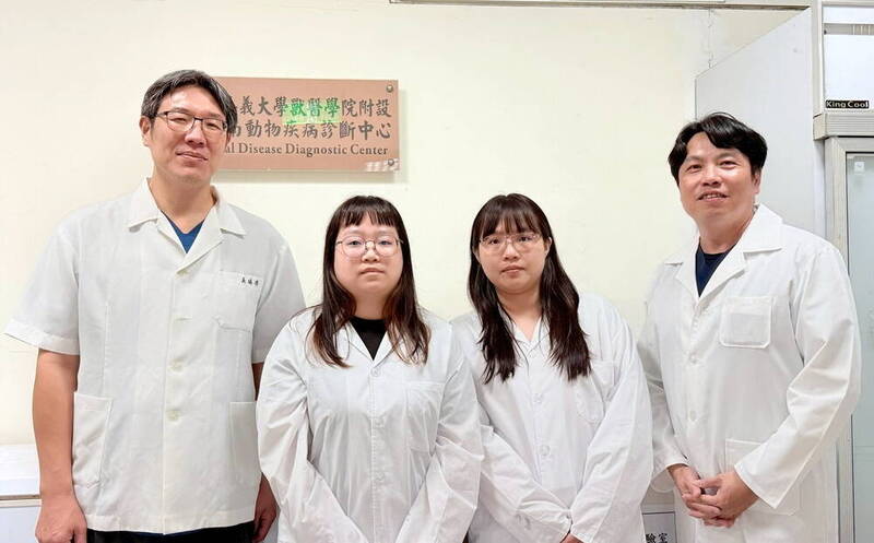 嘉大獸醫學院吳瑞得院長(左一)、非洲豬瘟初篩實驗室負責人郭鴻志教授(右一)與負責非洲豬瘟檢測工作的獸醫師合影。(嘉大提供)