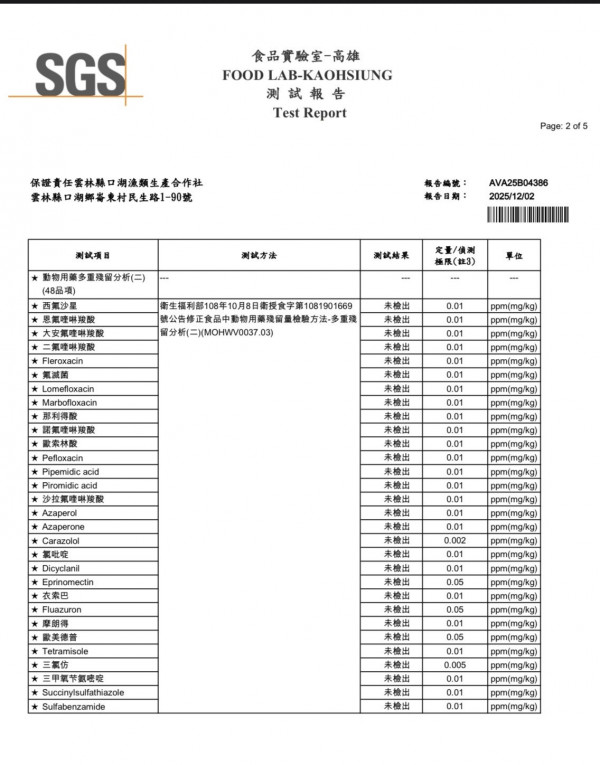 口湖漁類生產合作社也隨機抽樣同商品之不同批號,送交公正單位SGS進行檢測,結果也是未檢測出「恩氟喹啉羧酸」 。