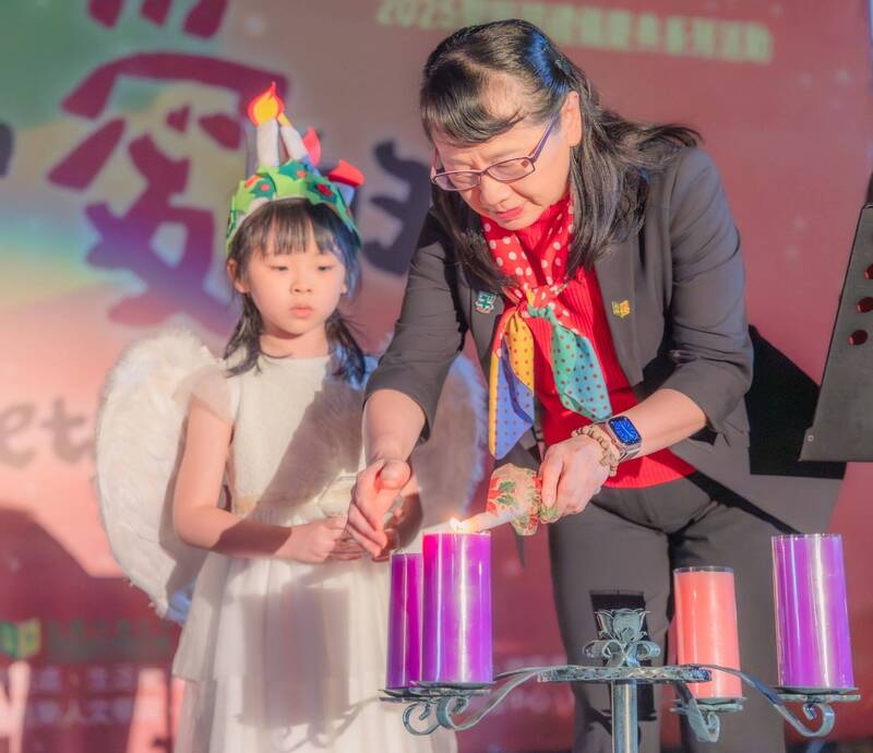 文藻燃燈禮點燈儀式,小天使率先點燃手中蠟燭,再由校長莊慧玲(右)接過這份光亮,依循天主教「將臨期」的傳統,點燃將臨圈象徵希望的第1根蠟燭。(文藻外大提供)