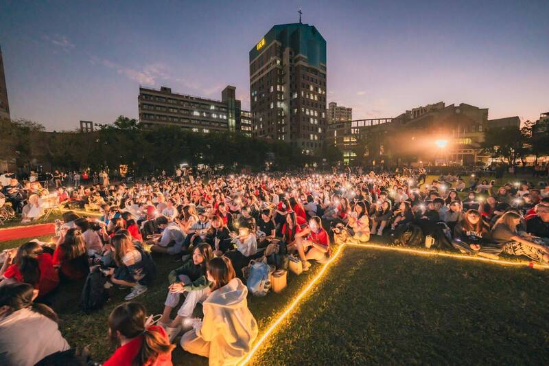文藻師生齊聚操場迎接誕節樹點燈活動。(文藻外大提供)