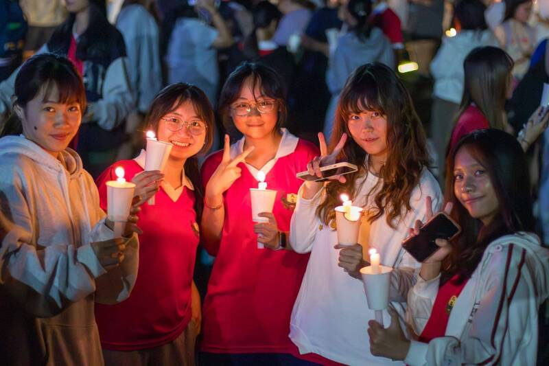 學生手拿燭光參加耶誕燃燈禮。(文藻外大提供)