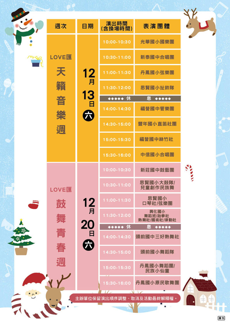 新莊區公所指出,13日率先登場的「天籟音樂週」,將由光華國小國樂團、中信國小合唱團、福營國中管樂團等團隊輪番上陣,以管弦、吹奏、合唱等多元形式,傳遞節慶祝福與悠揚樂音;20日的「鼓舞青春週」,邀請新莊國中鼓藝團、頭前國中三好熱舞社、丹鳳國小原民歌舞團等社團演出,以熱情節奏與青春律動感染觀眾。