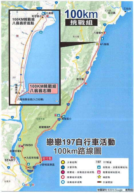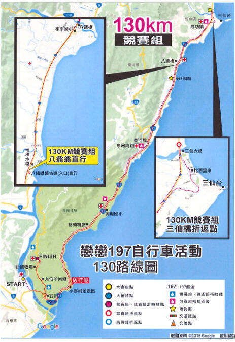 本次賽事共分為130公里的車隊菁英組與市民競賽組,以及100公里之挑戰組等3組。菁英組車速較快,台東縣警察局將派遣警力協助前導清道及重要路口交通管制。各組皆以卑南圳水利公園為起點,行經卑南堤防、台東大橋及台11線,其中菁英組與競賽組(130公里)於三仙橋北端折返,挑戰組(100公里)則於八邊橋頭折返,沿台11線原路返回,續行台11乙線後進入197縣道。計時終點設於52.5K處,選手通過計時終點後將持續沿197縣道至利吉部落(左轉環山路),最後經利吉大橋回到卑南圳水利公園。