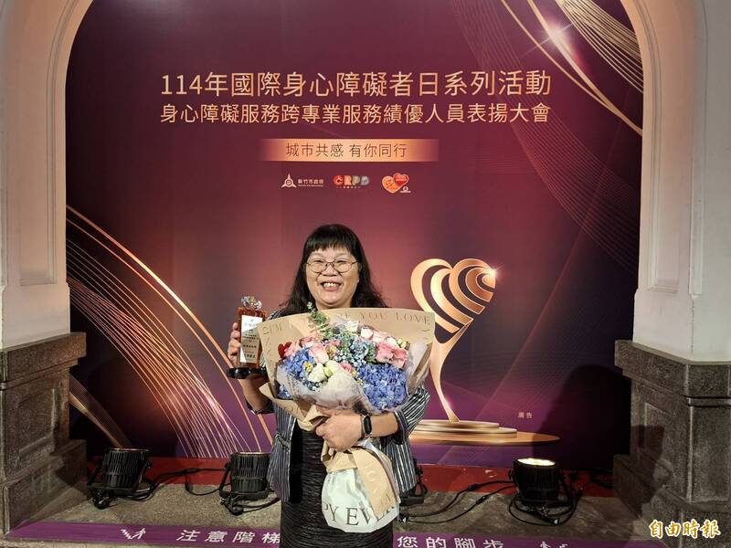 44年始終如一,新竹市蔡梅麗奉獻身障者獲市府頒發終身成就獎,獲獎實至名歸。(記者洪美秀攝)