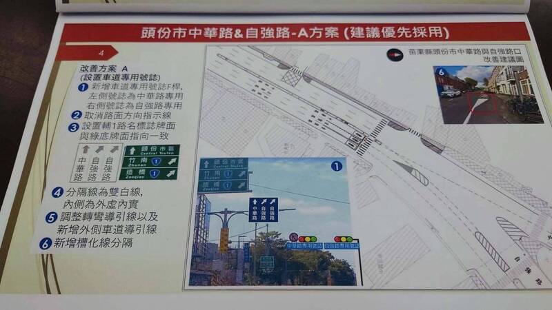 頭份中華路南下接自強路、中華路路口車道牌面不清楚,導致許多車流混亂,民怨沸騰。縣議員陳光軒、曾玟學多次辦理會勘、協調,但改善方案一直不理想,2人要求再提方案,並邀頭份市民代表周訓宇,與公路局中區養護工程分局苗栗工務段、縣府交通工務處及頭份警察分局等相關單位人員昨日會商。