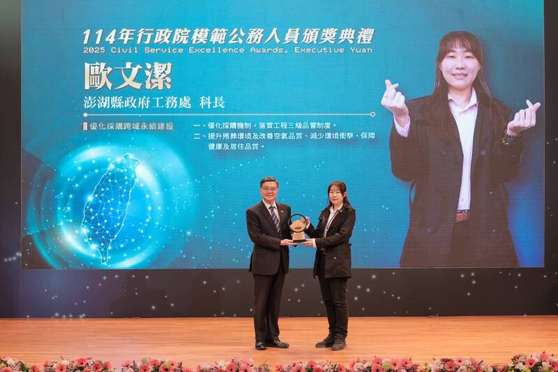 澎湖縣政府工務處採購科科長歐文潔,榮獲行政院模範公務人員表揚。(澎湖縣政府提供)