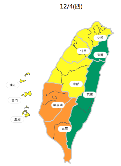空氣品質方面,週四受東北季風影響,境外污染物影響逐漸趨緩,中南部位於下風處,污染物易累積。宜蘭、花東空品區為「良好」等級;北部、竹苗、中部空品區及馬祖、金門、澎湖為「普通」等級;雲嘉南、高屏空品區為「橘色提醒」等級。