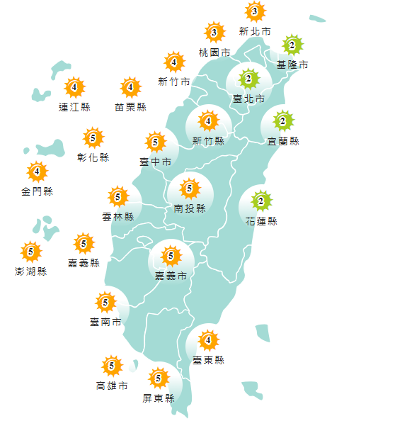 紫外線指數方面,週四基隆市、台北市、宜蘭縣與花蓮縣低量級,其他縣市達中量級。