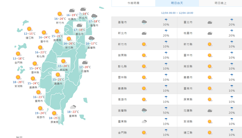 週四白天北部及宜花高溫只有19度至21度,中南部及台東高溫也略降到24度、25度,南北溫差較大,南來北往的朋友應注意氣溫變化。(擷取自中央氣象署網站)