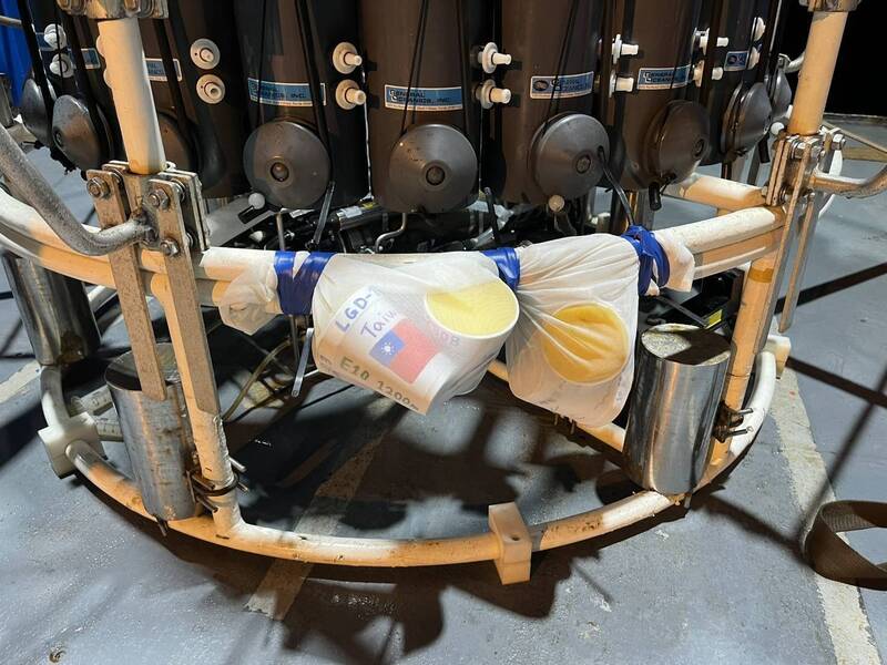 保麗龍杯下放深海之前,必須先塞海綿,再用洗衣袋包住,綁在儀器上。(國家海洋研究院提供)