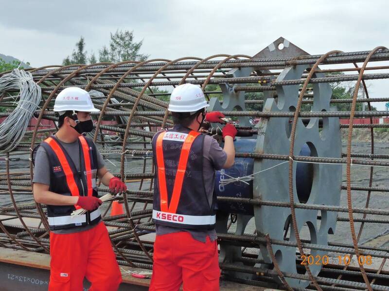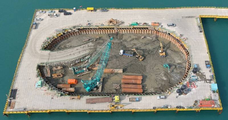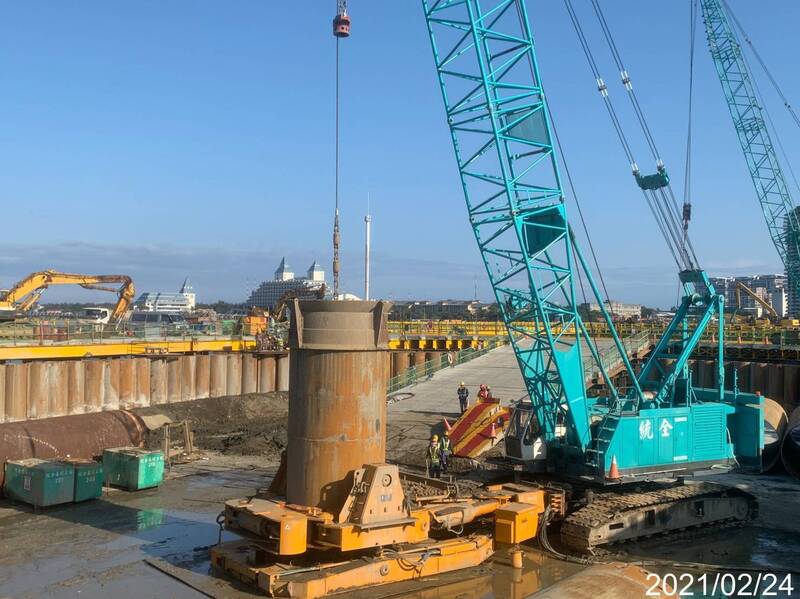 要如何讓基樁施作更穩定更安全?公路局表示,淡江大橋的基樁直徑達2.5尺,是全台最大尺寸,搖管機在打設鋼套管時扭力非常大,施工單位引進全台僅有3部的大能量搖管機,同時必須要有足夠反力支撐,因此在圍堰內以「回填土方並構築RC版」方式建構穩固的施工環境、提升地面承載力,機具操作更穩定,大幅提升整體施作安全性。