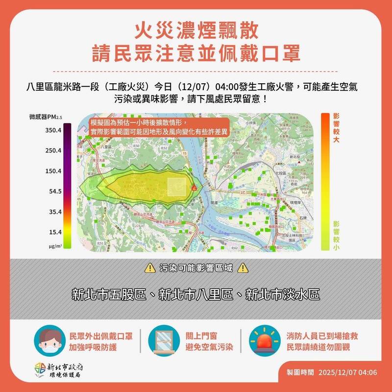 環保局指出,八里區龍米路一段工廠火災,經模式模擬煙霧及部分異味可能往下風處飄散,預估影響範圍包括五股、八里、淡水區,提醒鄰近居民緊閉門窗、外出記得配戴口罩,避免身體不適,環保局將持續監控更新空品變化,啟動相關應變作為。