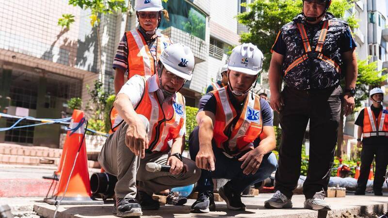 透過長期管網改善計畫,114年達成漏水率降至10%以下,每日節省約58萬公噸水量,相當於每年省下6成翡翠水庫蓄水量。圖為蔣萬安(右)視察管網改善工程。(資料照,台北自來水事業處提供)