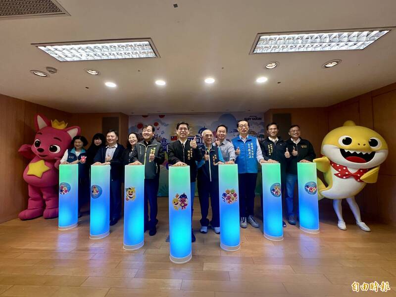新北市政府今(9)日宣布,2026年元旦升旗活動將移師板橋435藝文特區馬卡龍草原舉行,邀請人氣卡通明星碰碰狐與鯊魚寶寶同歡。(記者羅國嘉攝)