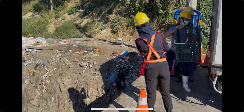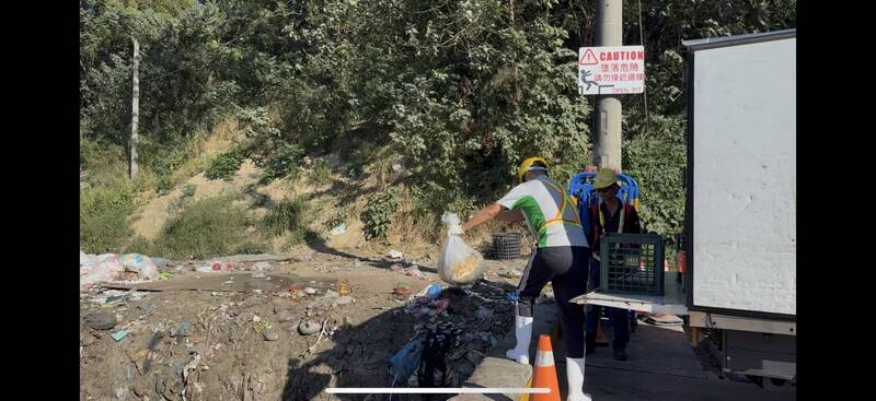 團膳業者在學校老師陪同下,把廚餘載往清潔隊指定場,倒掉廚餘,後續由清潔隊接手處理。(彰化市公所提供)