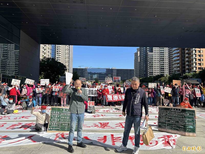 豐原反儲能自救會聚集在市議會前方陳情抗議。(記者蔡淑媛攝)