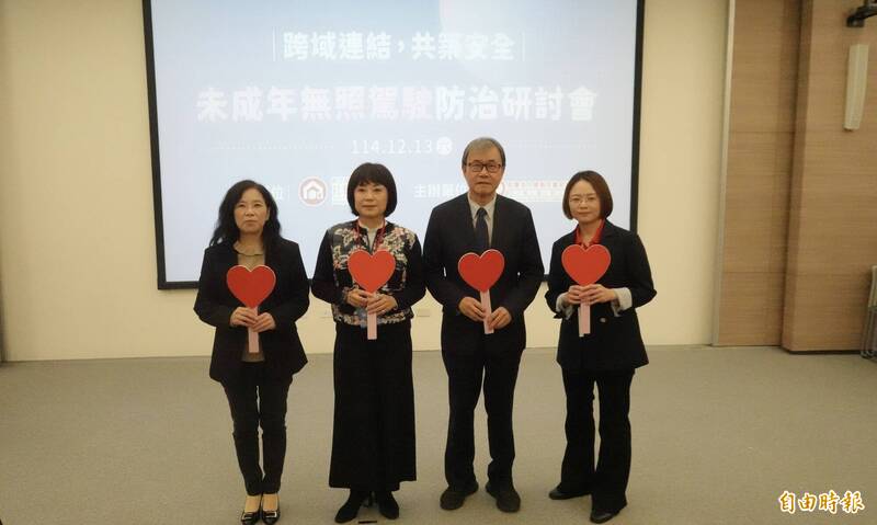 靖娟基金會OK 繃兒童服務中心今日舉辦「未成年無照駕駛防制研討會」,教育部長鄭英耀(右二)、立委林月琴(左二)皆出席,表達對青少年交通安全的重視。(記者林曉雲攝)