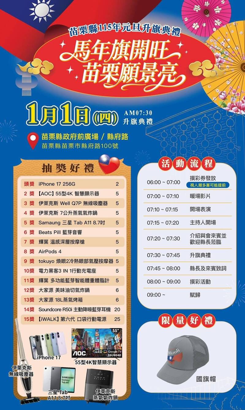 迎接2026,苗栗縣政府將於明年元旦早上7點半,於縣府第一辦公大樓前廣場舉辦「馬年旗開旺 苗栗願景亮」升旗典禮,準備有國旗帽、小國旗發放,及iPhone 17 256G、智慧電視、無線吸塵器、智能氣炸鍋、平板電腦等摸彩獎品,歡迎鄉親參與。