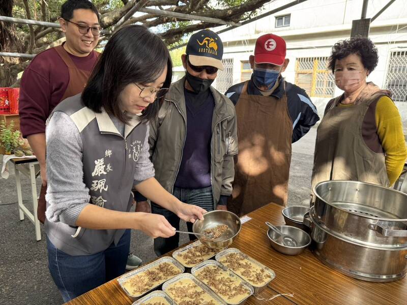 鹿草鄉長嚴珮瑜與民眾製作菱角鹹蛋糕。(鹿草鄉公所提供)