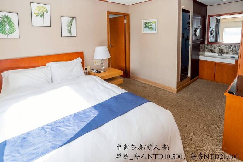 台灣業者華岡集團公布各艙房定價,單程不含碼頭服務費及其他稅金。皇家套房1張雙人床,每人1萬500元,每房2萬1000元;豪華套房2張單人床,每人5600元,每房1萬1200元;家庭房4人通鋪,每人5600元,每房2萬2400元。