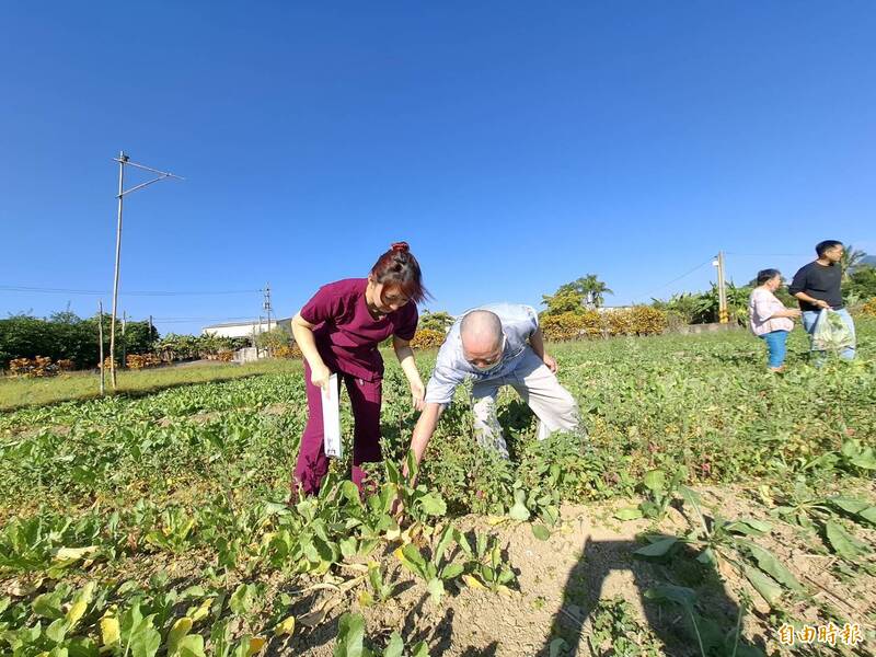 照護人員引領失智失能長輩走進田園拔蘿蔔。(記者蘇福男攝)