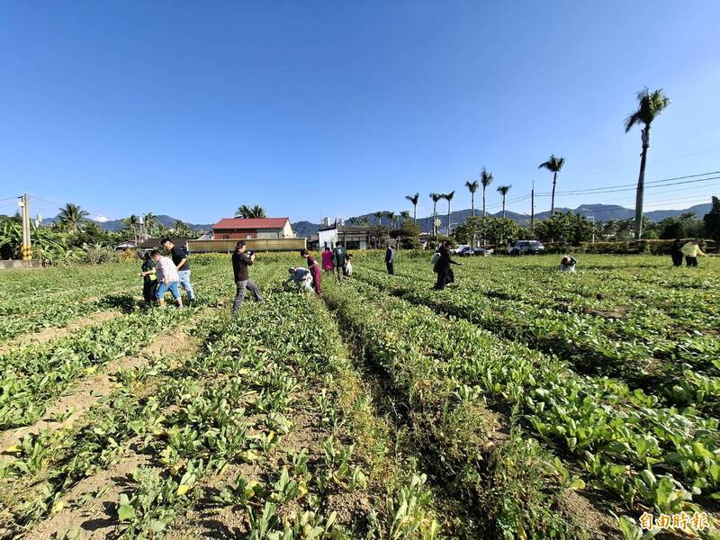 高雄旗山「搖滾農夫」黃盟生種白玉蘿蔔做公益,蘿蔔田開放給民眾自由採摘樂捐,所得將全數捐給「高雄市小鄉社造志業聯盟」,在地長照機構「艾維格林」10多位失智失能長輩,今天下午化身「一日公益農夫」拔蘿蔔挺社造。