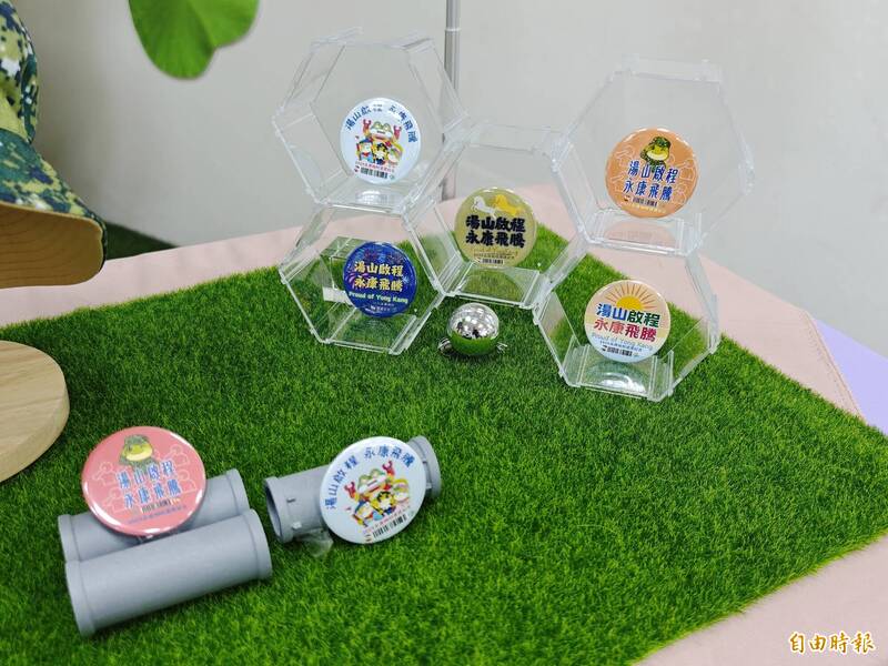 永康公所推出的紀念「湯包」,徽章有7種款式。(記者吳俊鋒攝)