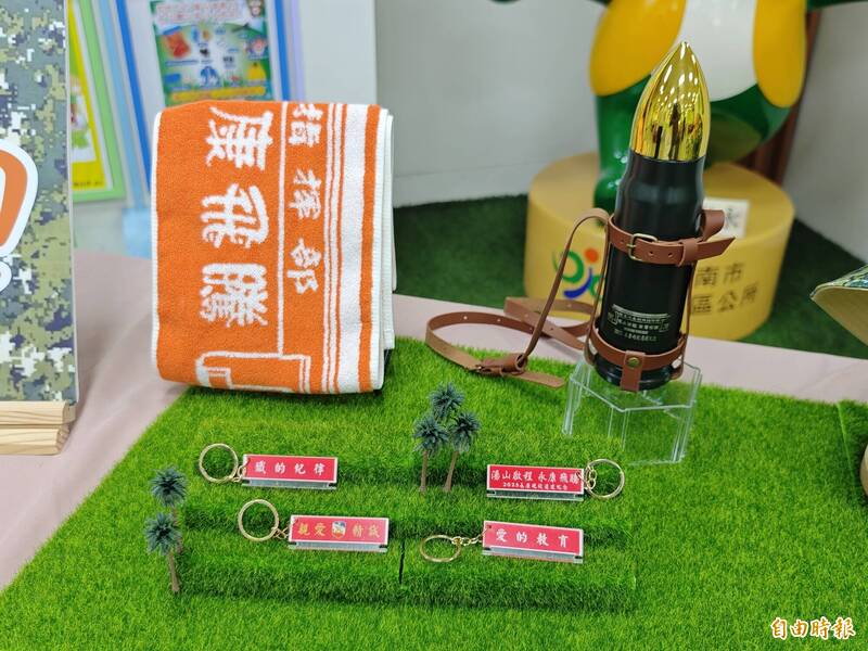 李皇興說,湯山紀念包是公所獨家推出,將營區入口意象圖騰刻印在系列的裝備上,設計有7款徽章、3種鑰匙圈,採隨機方式與砲彈造型水壺、專屬背帶、應援毛巾、野戰帽等,以迷彩帆布袋組合成套,都是實用而且有文化感的設計,限量800份。