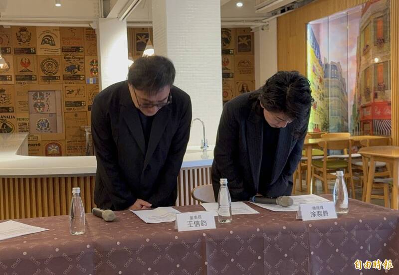 董事長王信鈞與總經理涂裴鈴對外鞠躬致歉,坦承錯誤。(記者蔡淑媛攝)